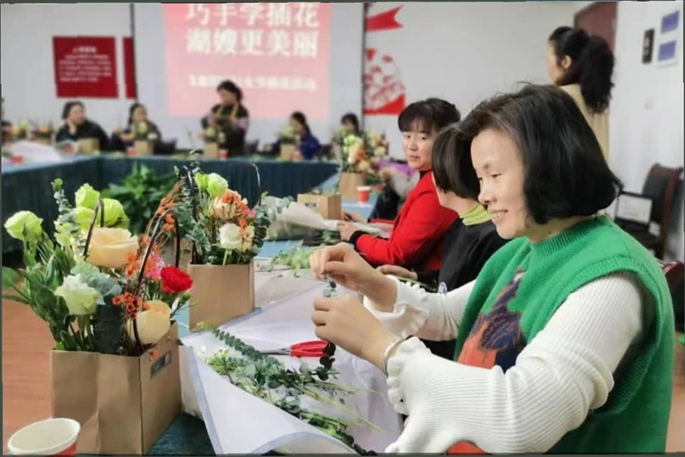 近日,下渚湖街道成校分别在和睦村、二都村举办庆“三八”妇女节美丽生活沙龙活动,组织村民学习插花技艺(图①)。