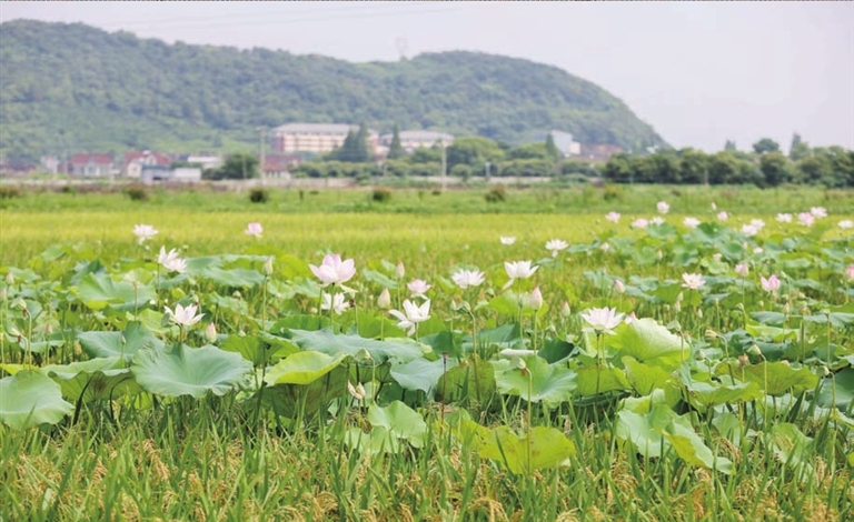7月21日,康乾街道联合村一处稻田里,荷花与稻田相映成趣,成为一道别样的风景。