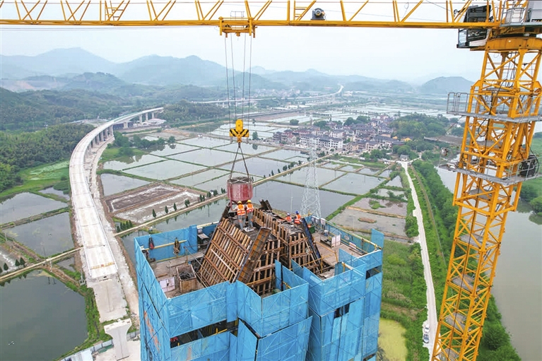 中铁二十四局杭德市域铁路项目副总工程师任超超介绍,斜拉桥跨越东苕溪,施工区域地质条件复杂,且桥塔高度高、跨度大,主塔采用新型智能液压爬模系统,悬浇梁采用8m长后支点挂篮等技术保障,有效提高成品外观质量和施工效率,进一步降低误差,确保桥塔建设精准无误。中铁二十四局项目部通过优化施工方案、倒排工期、增加人力物力投入,高峰期近200人协同作业,确保工程按节点推进。